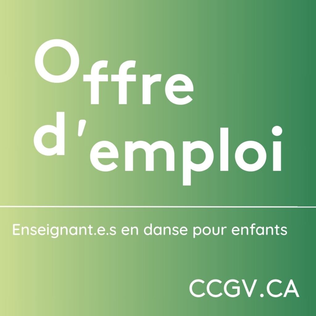 Le CCGV est à la recherche d’enseignant.e.s afin de développer de nouveaux cours pour les enfants et ainsi bonifier le volet danse de la programmation. Nous sommes à la recherche d’enseignant.e.s dynamiques et dévoué.e.s qui ont à cœur la transmission de la danse dans une approche inclusive.