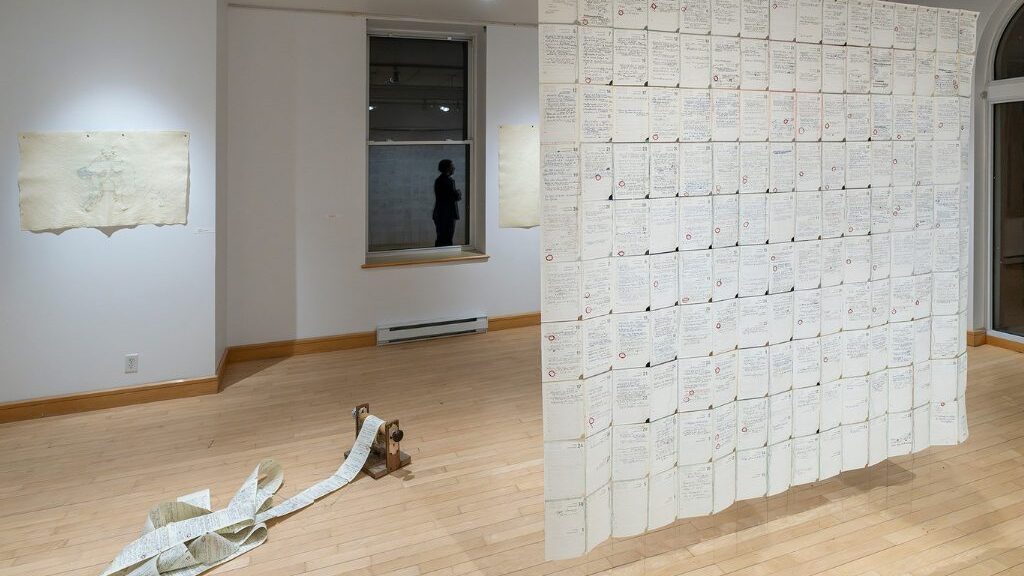 À cet ensemble s’ajoutent les œuvres Je, Jean-Marc, j’étais. Le Je, c’est lui, Jean-Marc, mon père atteint d’Alzheimer, dont j’ai été l’aidante naturelle durant plusieurs années. Chaque œuvre présente les pages de ses derniers agendas. À travers celles-ci, se révèle l’homme de science qu’il était, systématique et précis dans ses données recueillies au quotidien. Lorsqu’il se nomme, mon père le fait en écrivant JM, comme par exemple « JM va au lit à 22h ». J’ai souligné d’une ficelle rouge ou d’une gravure, chacune des mentions de ce Je qui s’exprime. Les pages sont cousues à la main par des fils ballants, dont les couleurs évoquent celles de la nature au rythme des saisons. Ainsi, le rougeoiement de l’automne ou la blancheur de l’hiver se nuancent côte à côte, de même se lient les jours au fil du temps et me relient à ces jours passés.