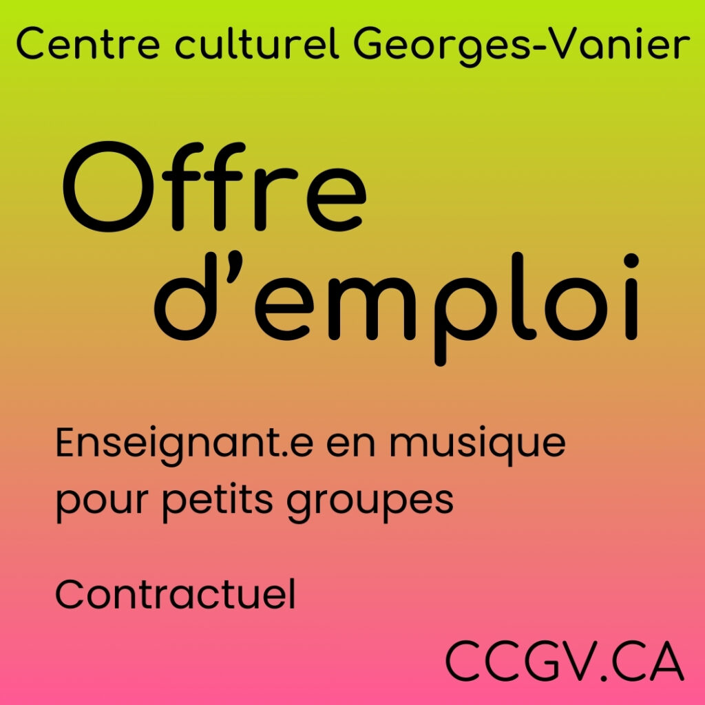 Le CCGV souhaite mettre de l’avant la pratique collective de la musique dans sa programmation 2024-2025. En ce sens, nous sommes à la recherche d’enseignant.e de musique ayant à cœur l’accessibilité des arts et la démocratisation de la culture.